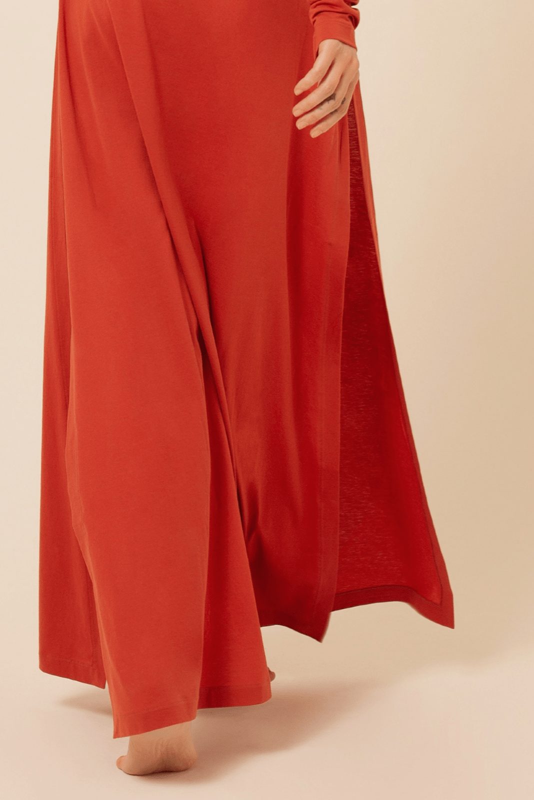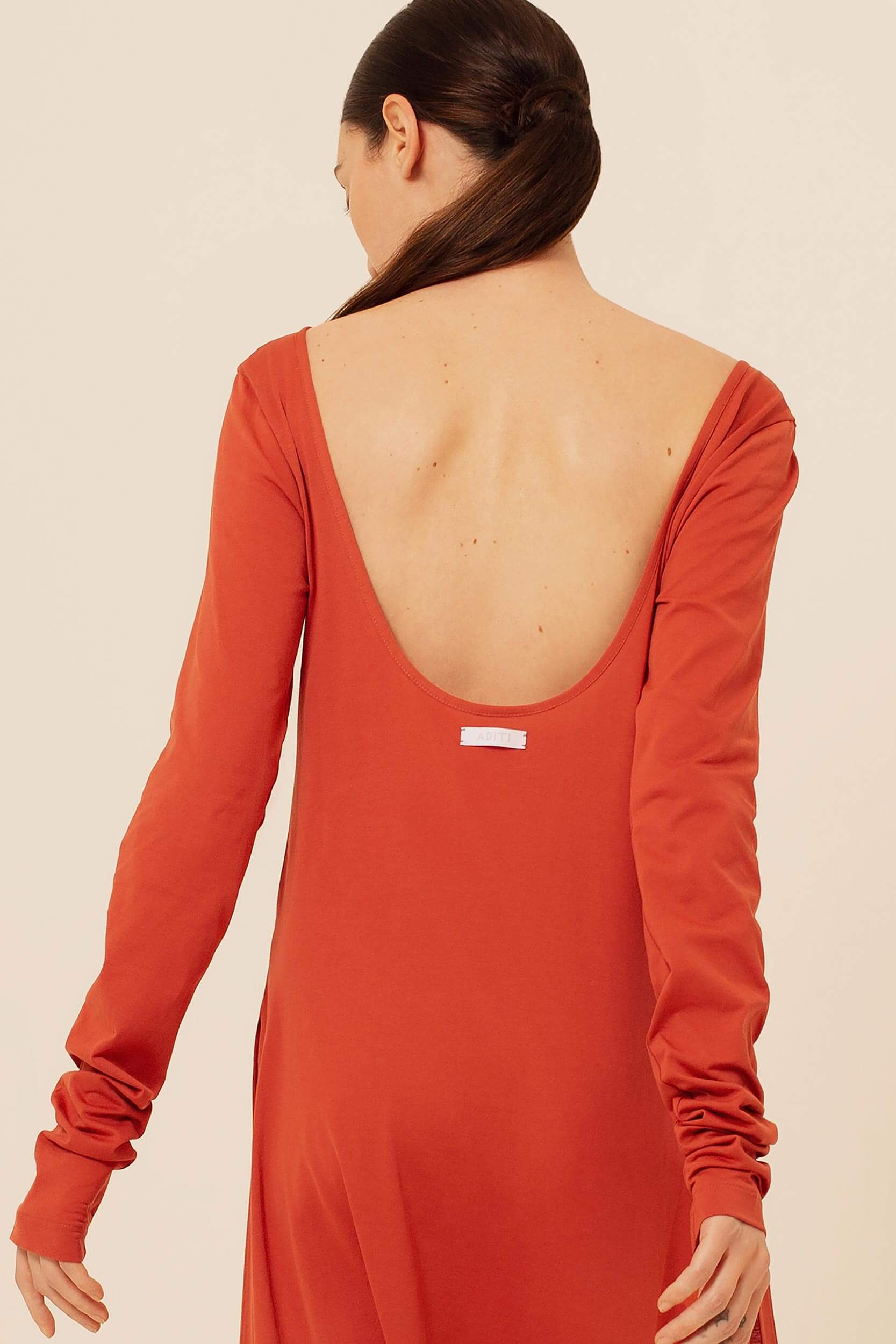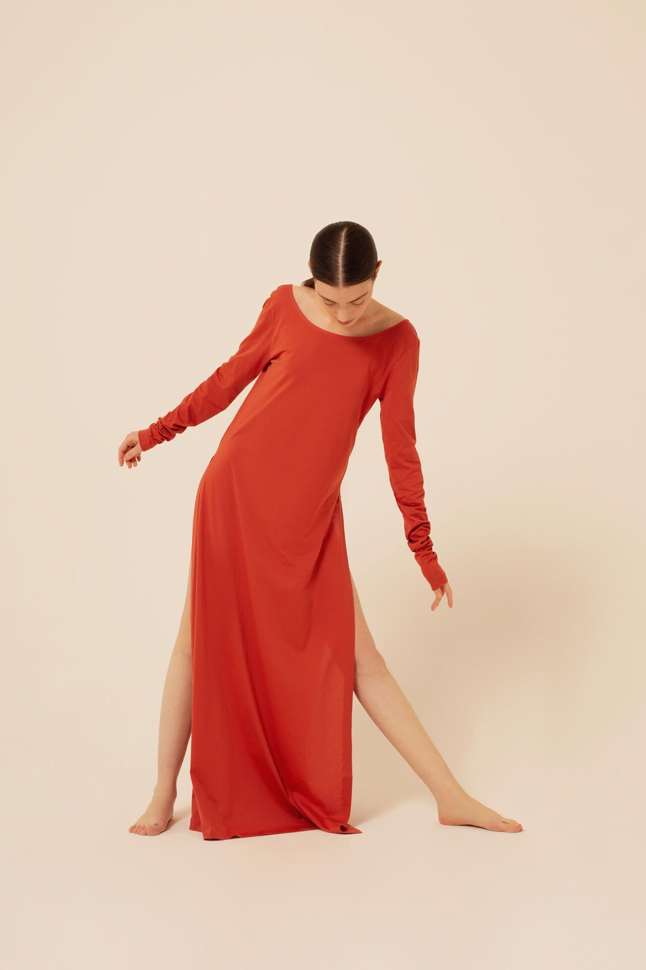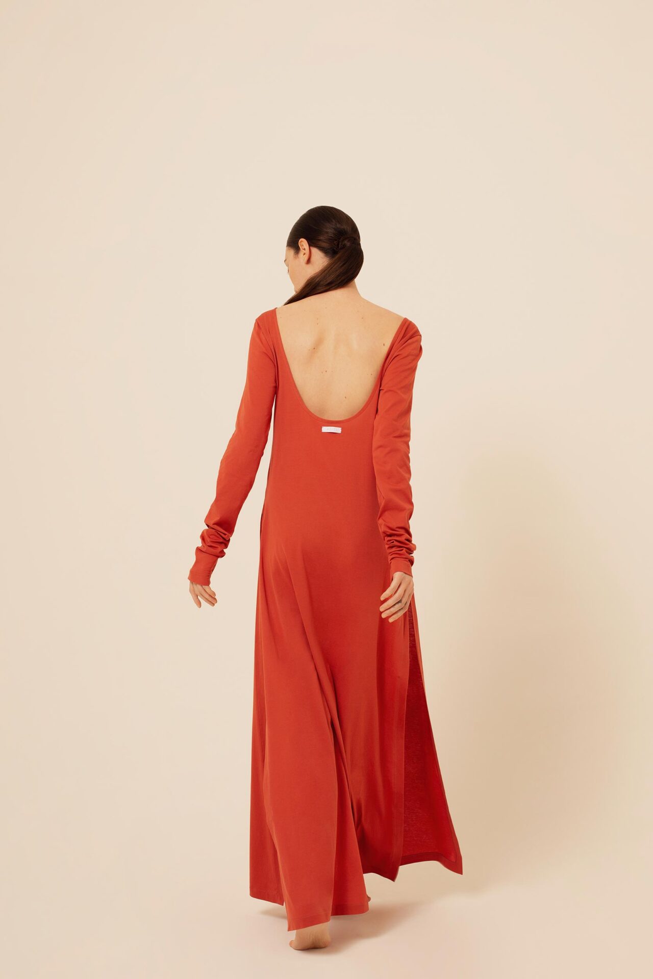 La tunica LYN è un abito lungo, con spacco laterale, realizzato con pregiati filati di cotone biologico organico, che le conferiscono straordinaria leggerezza e morbidezza. Il fit regolare è impreziosito dalle lunghe maniche, i profondi spacchi laterali e l’ampio scollo sulla schiena. La profonda apertura sul retro, ricorrente in molti capi della collezione, è una scelta stilistica come metafora di gratitudine e apertura al passato.