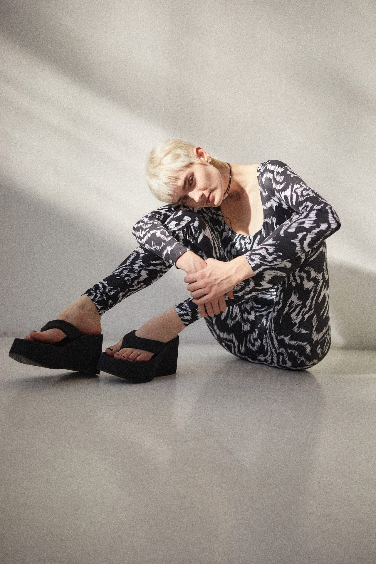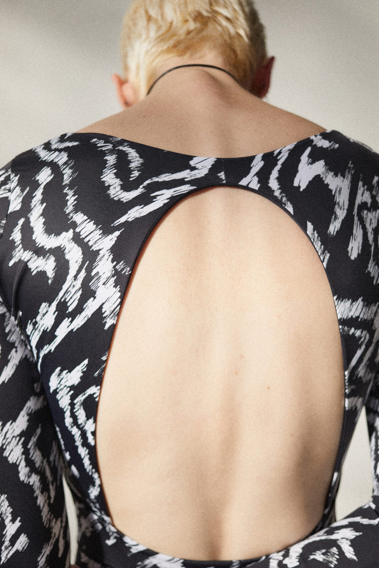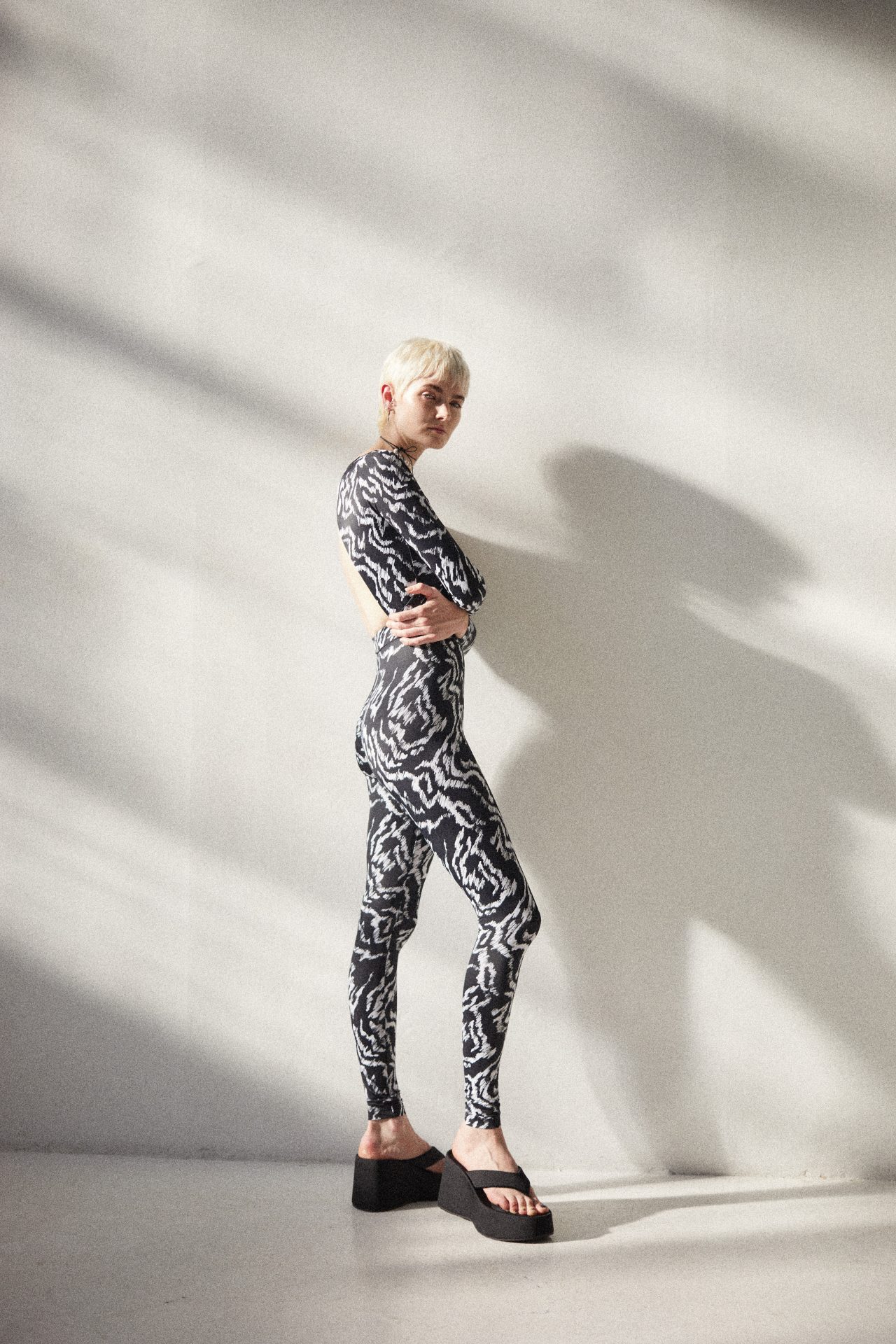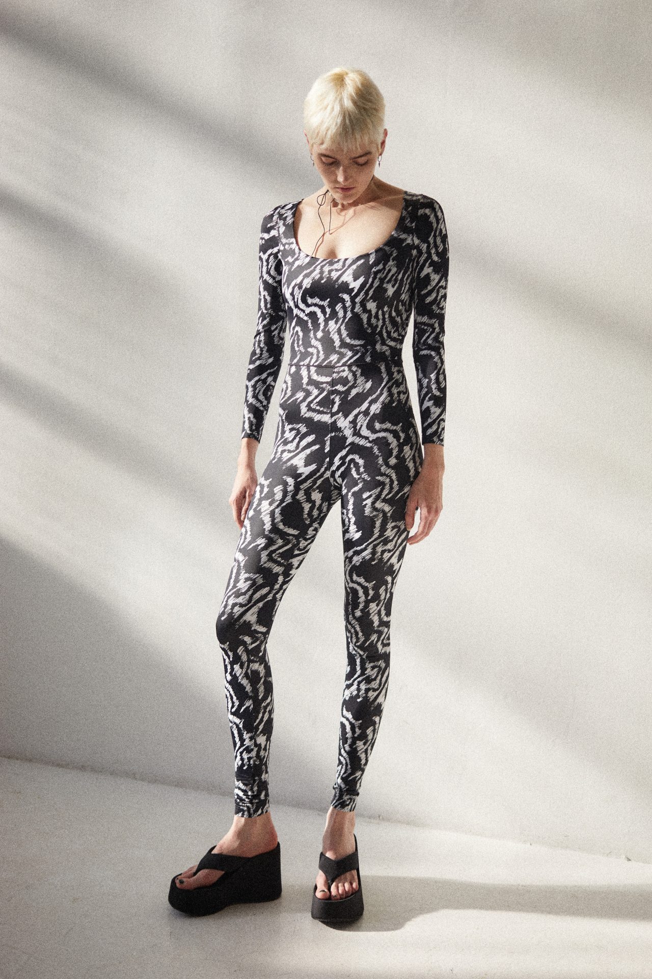 La tuta CHANDRA è disponibile nelle due varianti tinta unita nero e stampa black & white.